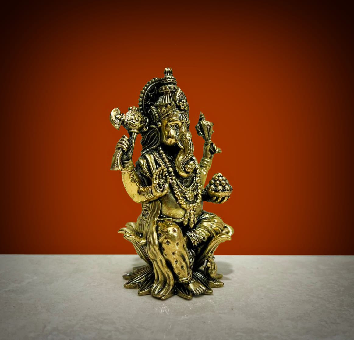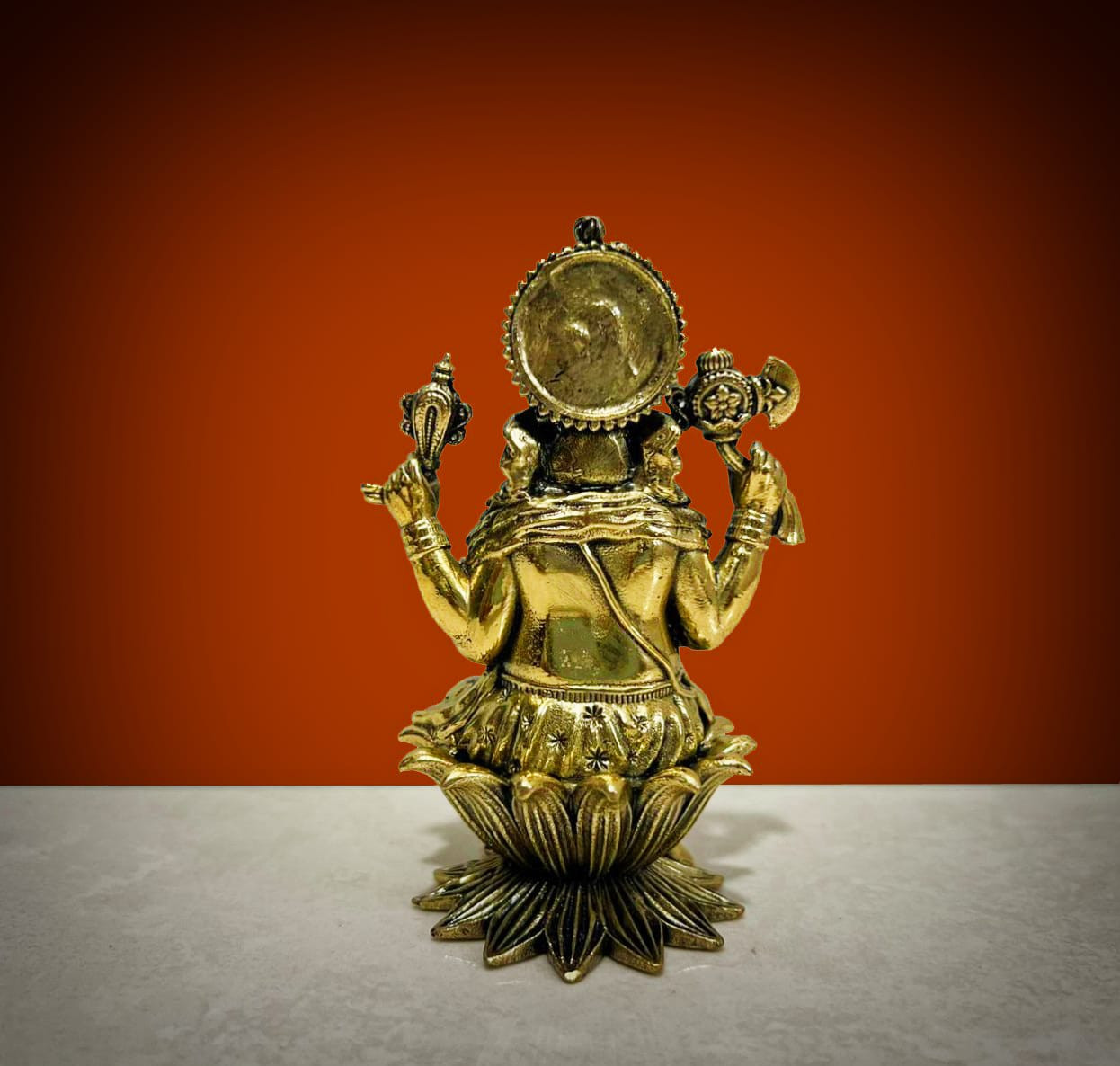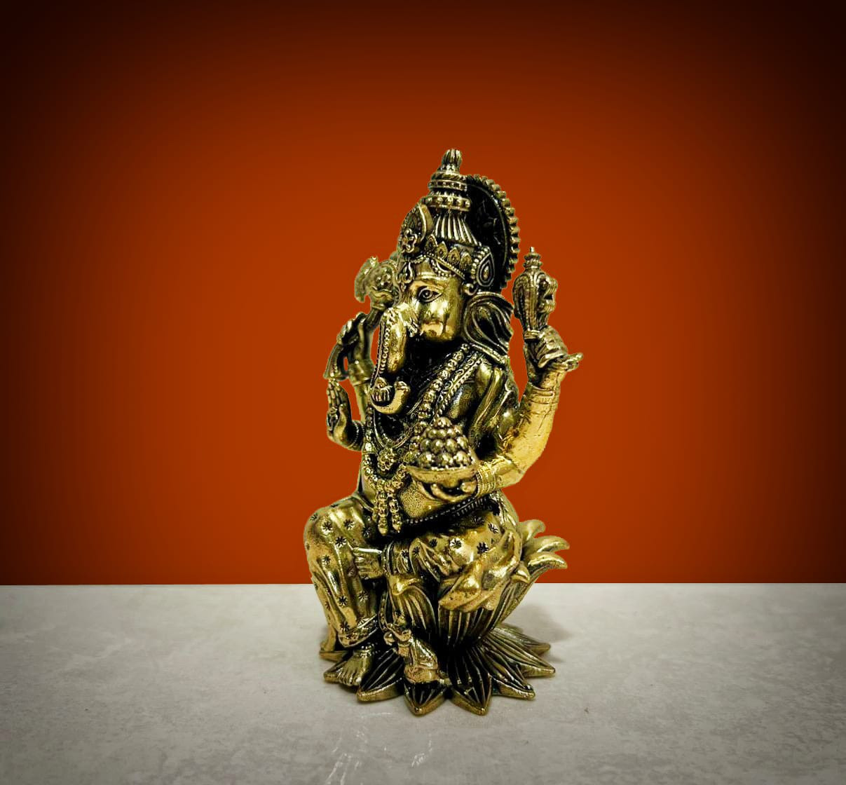 Brass Ganesh Sitting On Lotus with Ring Stone