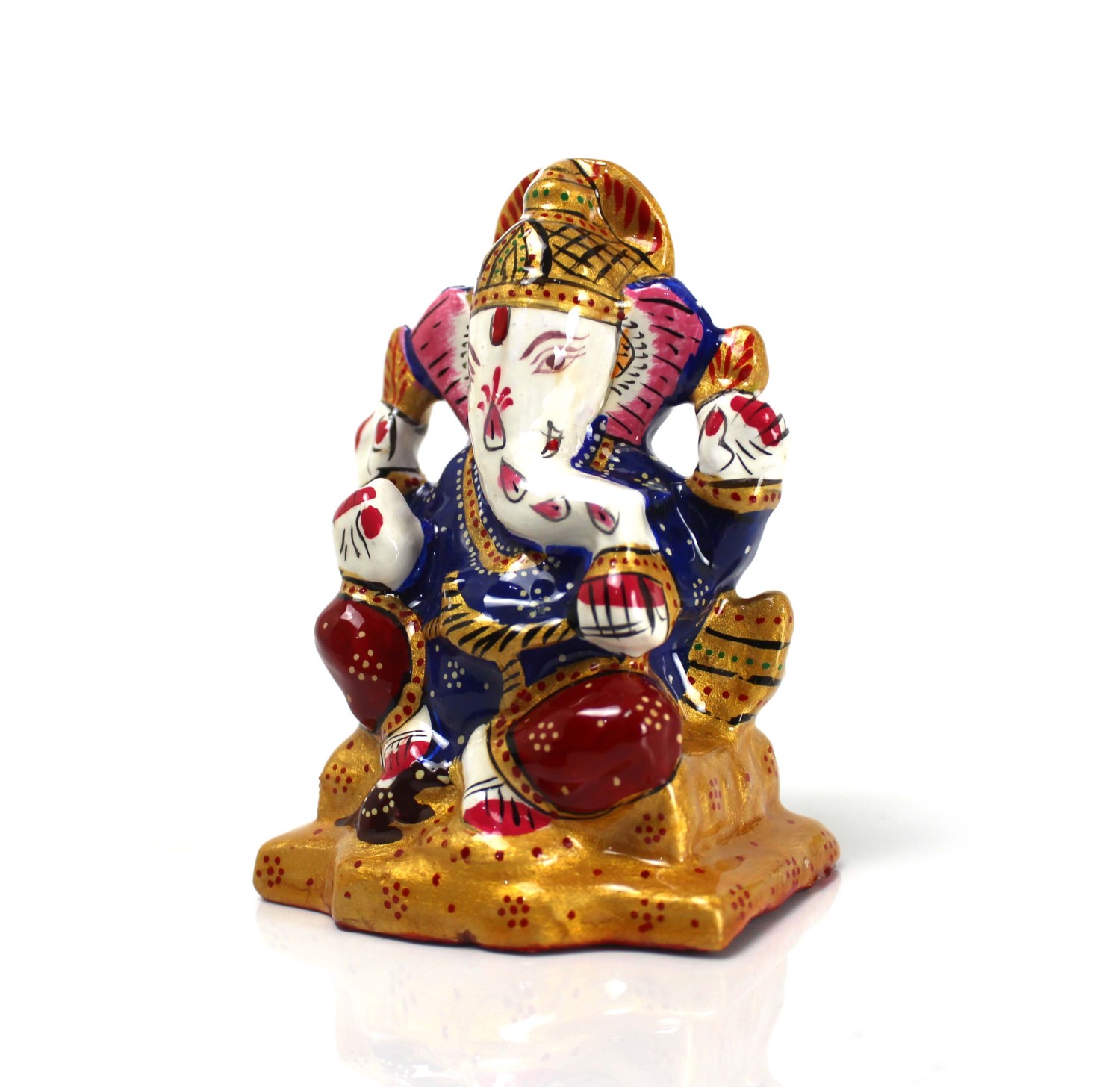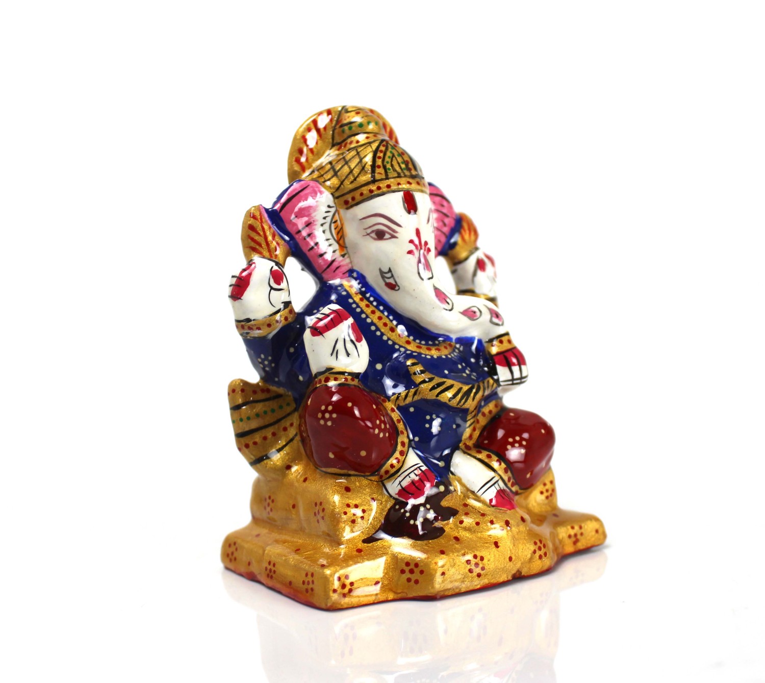 Nirmala Handicrafts presents to you a beautiful Lord Ganesh or Ganesha statue in metal. This representation of the almighty will bring tranquility to your home. Made of Metal you can place it easily on your table or in your home temple. It will also add to your home decor and table decor. Ganesh Idol Beautifully Handpainted Statue for Your home Temple and Home Interior. It is also a good gift article.