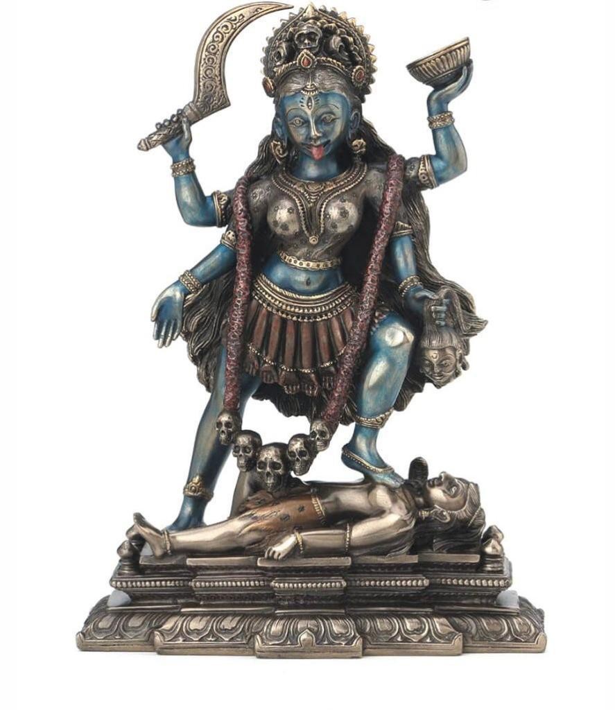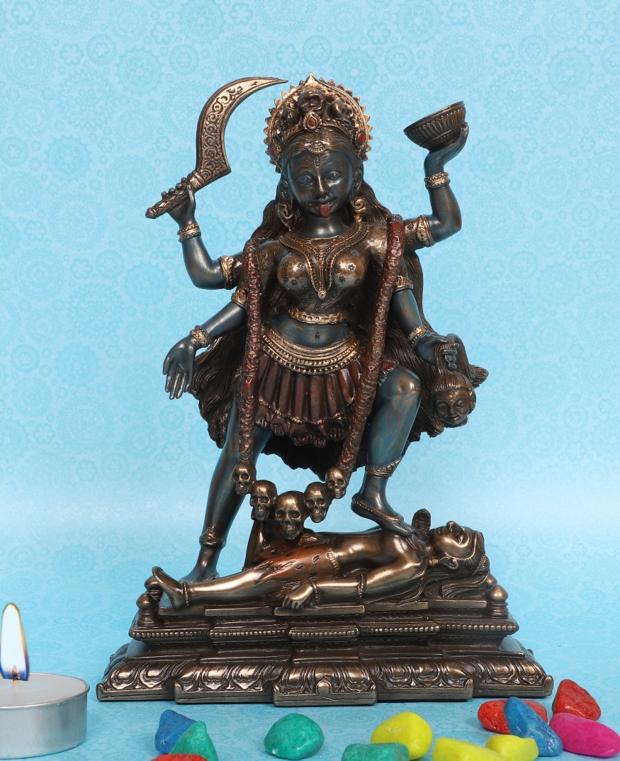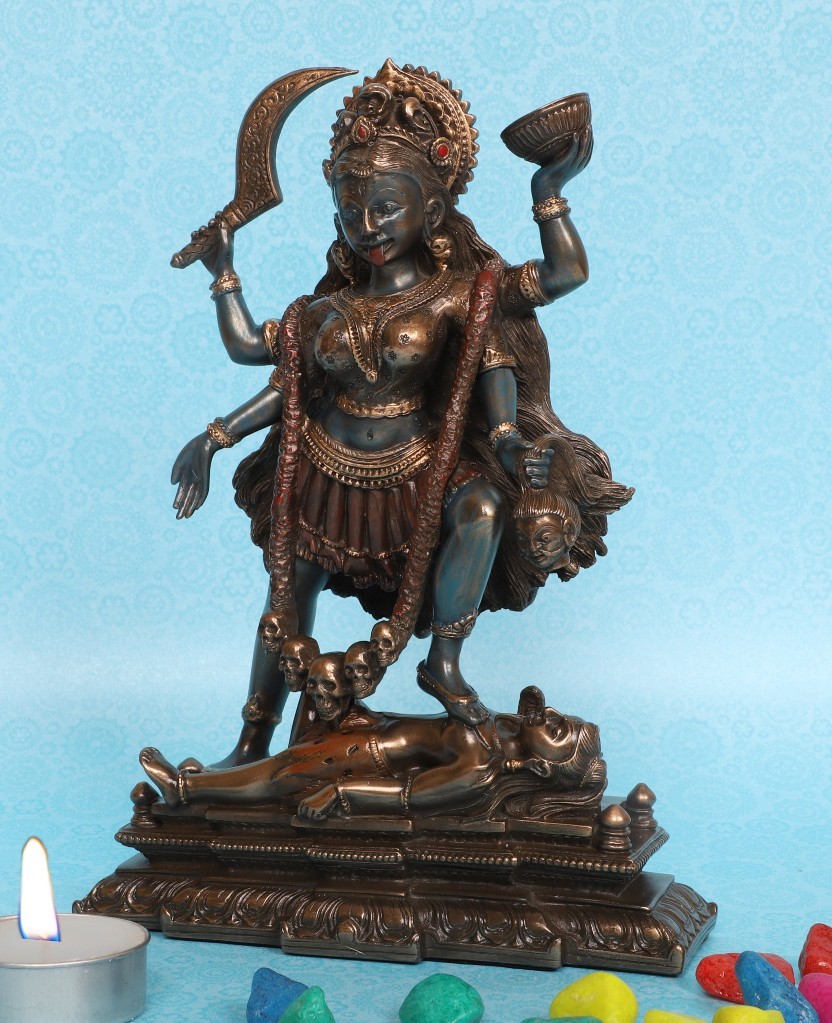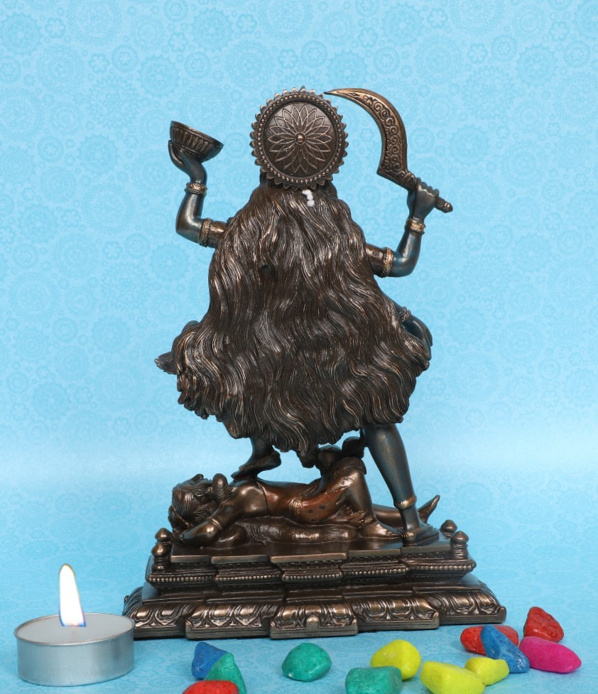 Goddess Kali, is the fearful and ferocious form of Goddess Durga. She is depicted to have born from the brow of Goddess Durga during one of her battles with the evil forces. Kali is represented with perhaps the fiercest features amongst all the world's deities. Her tongue protrudes from her mouth, her eyes are red. She stands with one foot on the chest of her husband, Shiva. Durga is Durgatinashini, one of many names given to Goddess Durga is Durgatinashini. The one who destroys the bad going of somebody. Idols are not the idle fancies of sculptors,but shining channels through which the heart of the devotee is attracted to and flows towards God. Though the image is worshipped, the devotee feels the presence of the Lord in it and pours out his devotion unto it. Intricate craftsmanship can be seen on this exclusive product. Very few of these pieces are made which makes them so exclusive. Made using several man hours and using age old method of art form. Painstakingly beautiful and truly majestic. This is an exclusive collector's item.