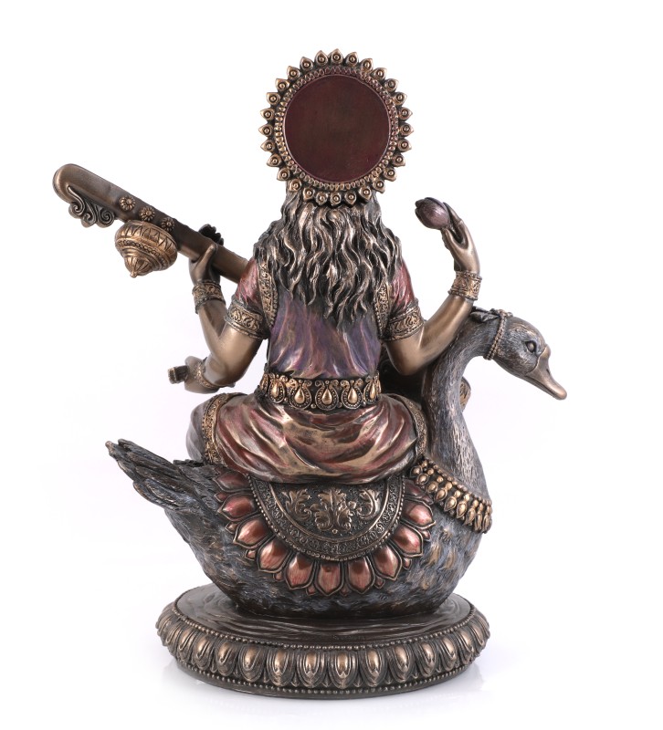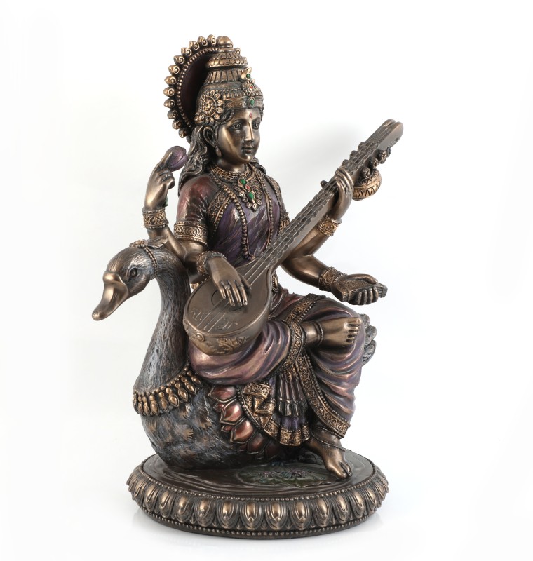 Beautifully handcrafted marble dust finish Goddess Saraswati in sitting position. She is the Goddess of learning, arts, knowledge, and wisdom. Saraswati means "the essence of the self." Don't miss looking at all detailed hand carving on the Saraswati sculpture. She holds a book and a rosary in her rear two hands, while the front two hands are engaged in the playing of a beautiful peacock lute (veena). Truly functional elegance, give it as a gift or use it in your office or home! Spiritual Lucky Gift, Thanksgiving Gift, Anniversary Gift, Wedding Gift, Birthday Gift, Diwali Gift.