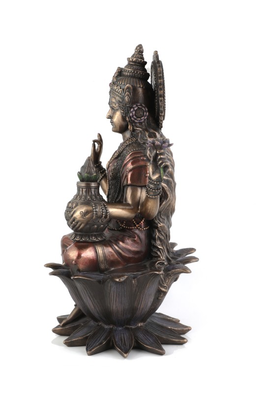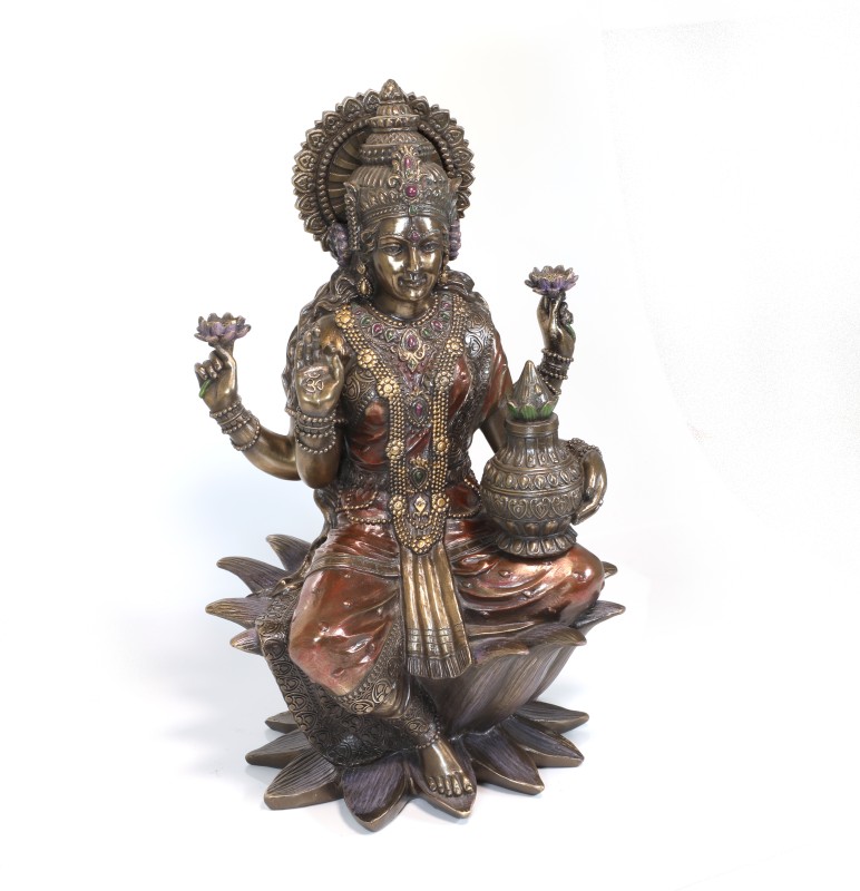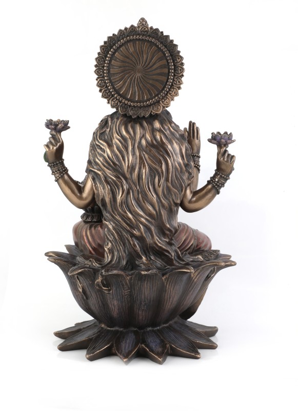 Lakshmi is the Hindu goddess of wealth, fortune, and prosperity (both material and spiritual), as well as the embodiment of beauty. Lakshmi name is derived from Sanskrit root words for knowing the goal and understanding the objective. This symbolism has a dual meaning: wealth manifested through Lakshmi means both material as well as spiritual wealth. She is the wife and shakti (energy) of Vishnu, a major god in Hinduism. Made from Quality Polyresin and Handmade in India. Mateial : Cold Cast Bronze (The statue is not Bronze but a composite of bronze and resin. This process makes this piece richer looking and enhances your room!