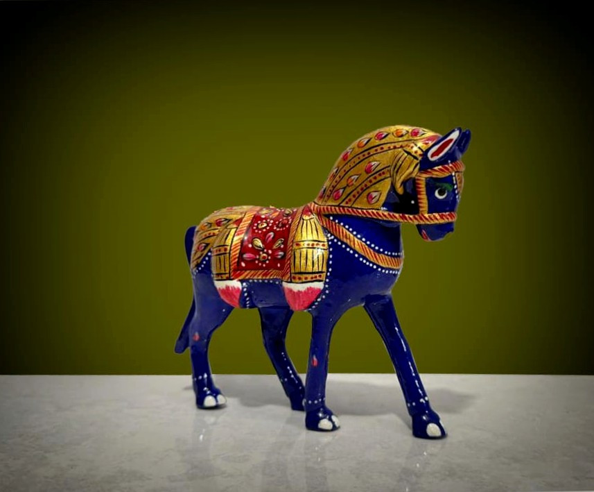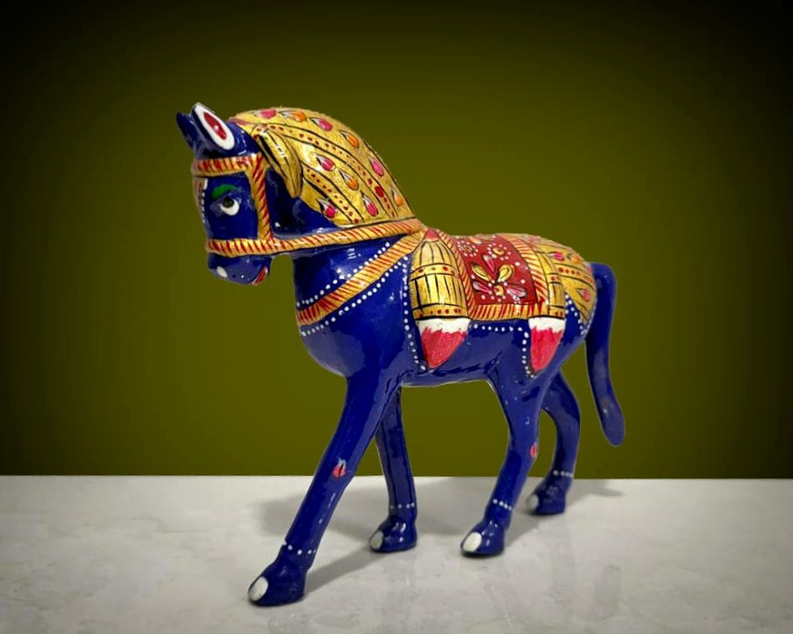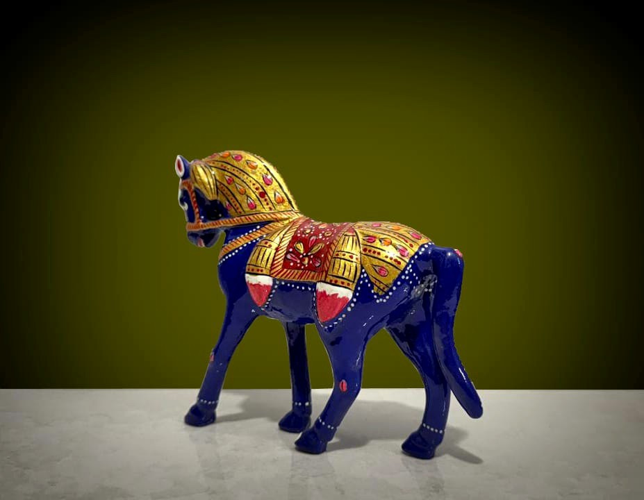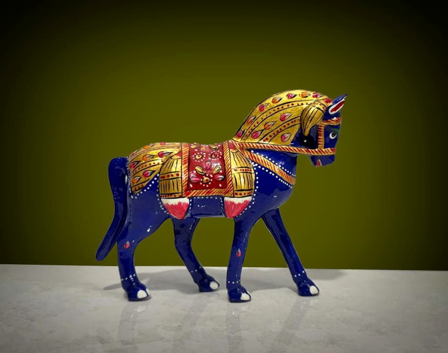 This beautiful MEENAKARI METAL HORSE is made of Metal. Animal figures are a brilliant example of art. They reveal the hard slog the craftsmen put in to turn the bare pieces into a work of art. The horse is a universal symbol of freedom without restraint because riding a horse made people feel they could free themselves from their own bindings. Also linked with riding horses, they are symbols of travel, movement, and desire.