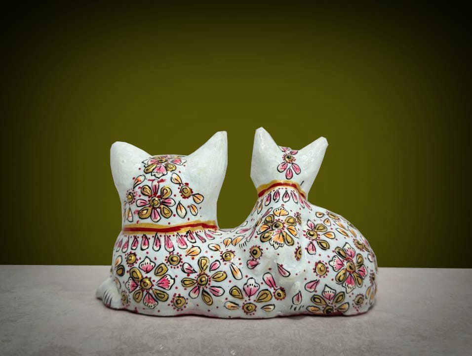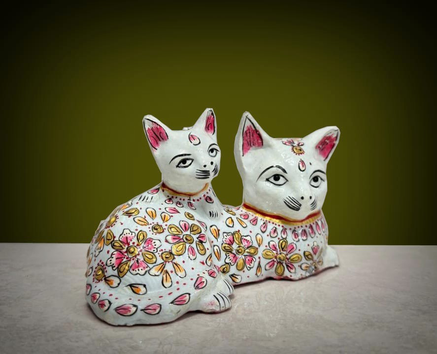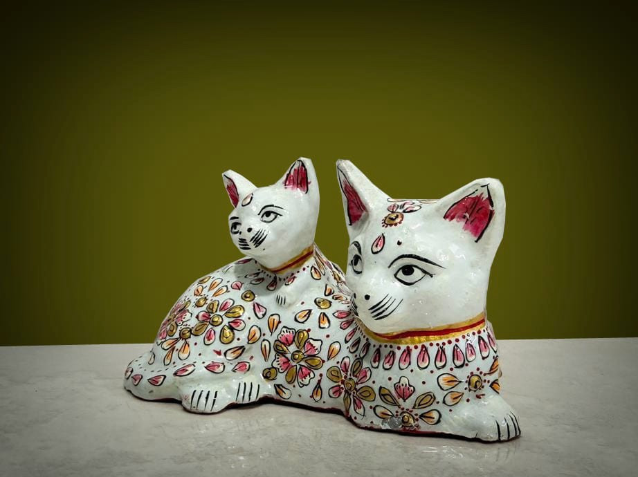 Metal Meenakari Cat with Baby Cat Figure | Enamel Painted Sitting Cat with Kitten