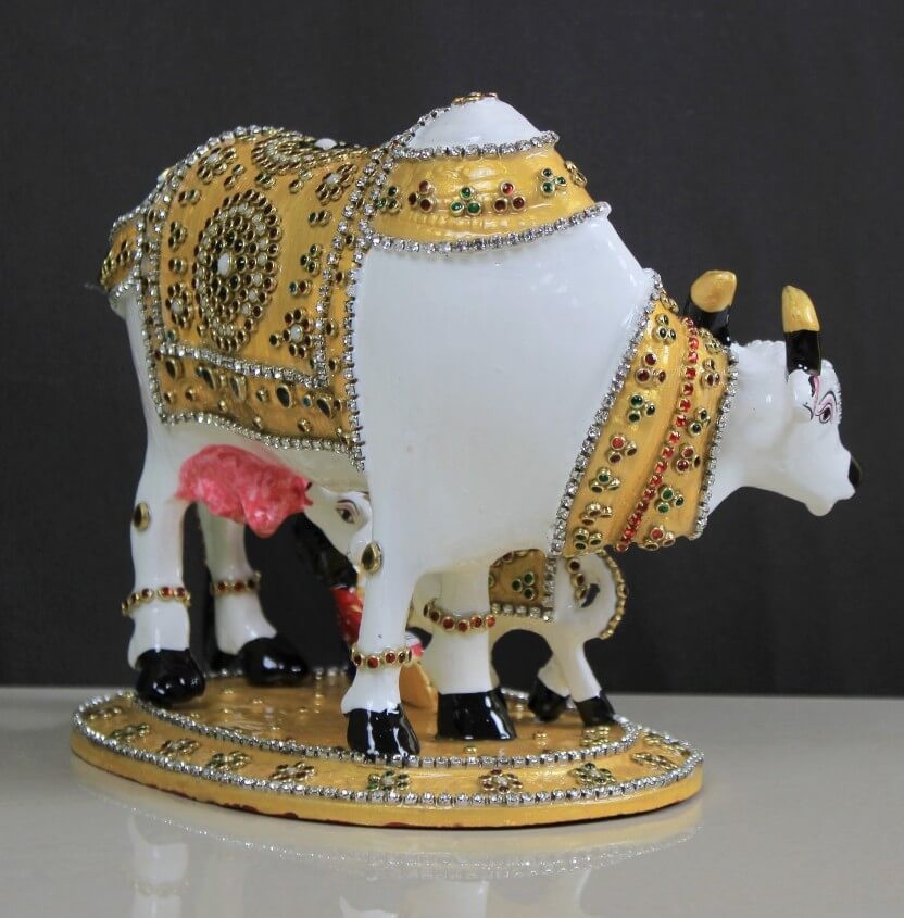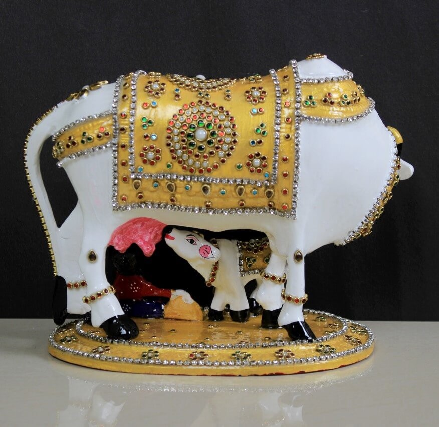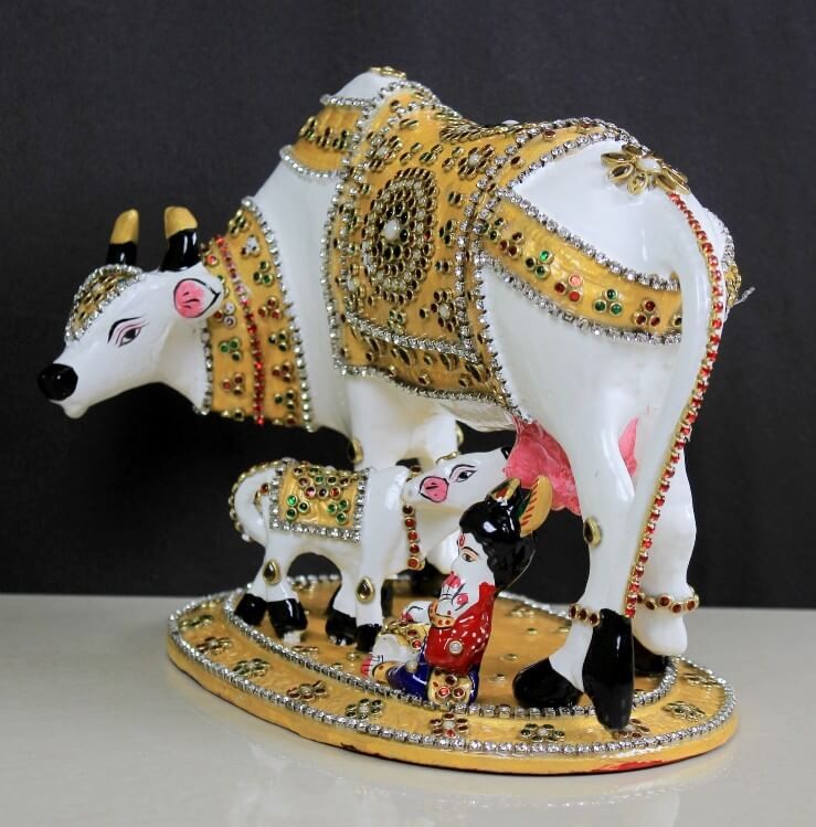 STONE WORK COW CALF STATUE WITH LADDU GOPAL